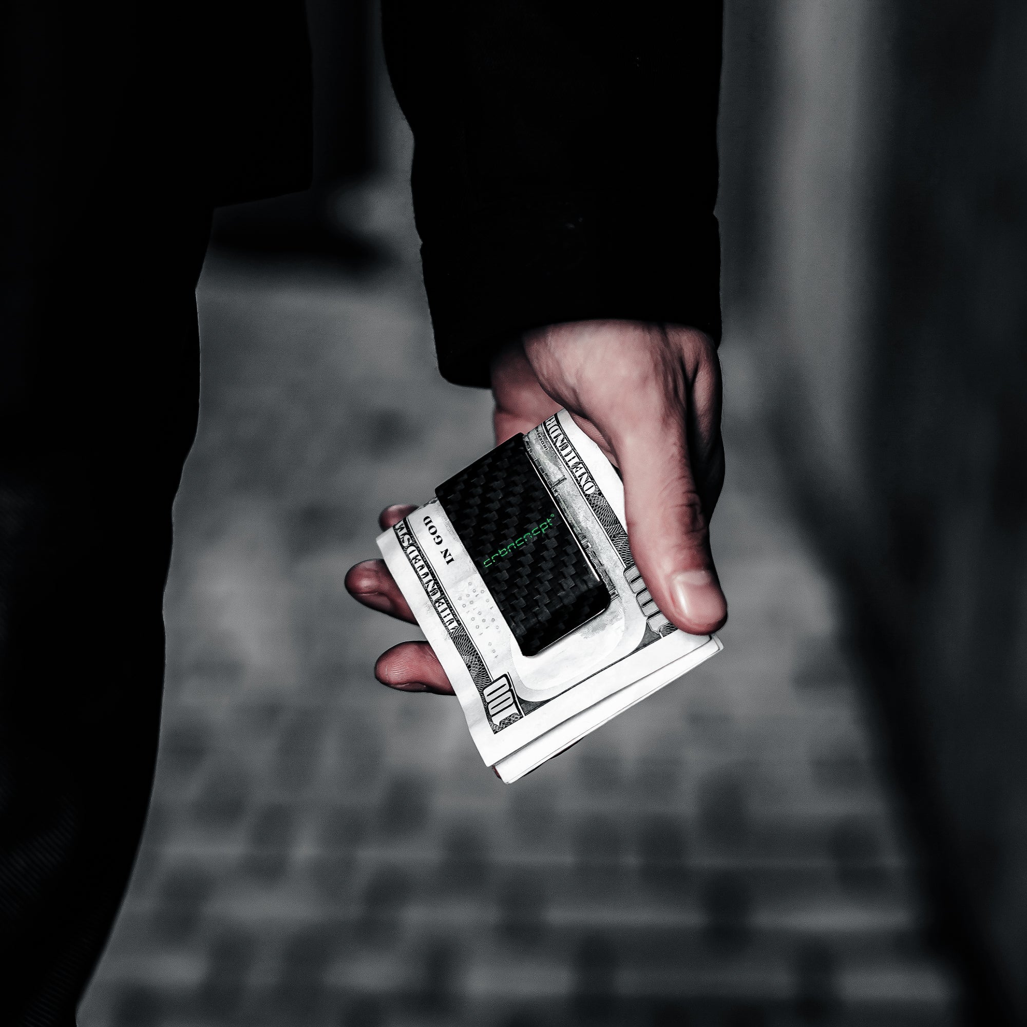 Reduziert auf Bargeld: Geldklammer aus Carbon Fiber (Kohlenstofffaser) oder Forged Carbon. Ultraleicht, robust und auf ewige Spannkraft ausgelegt. Klein im Format, klar in der Linie – gemacht für jeden Tag.