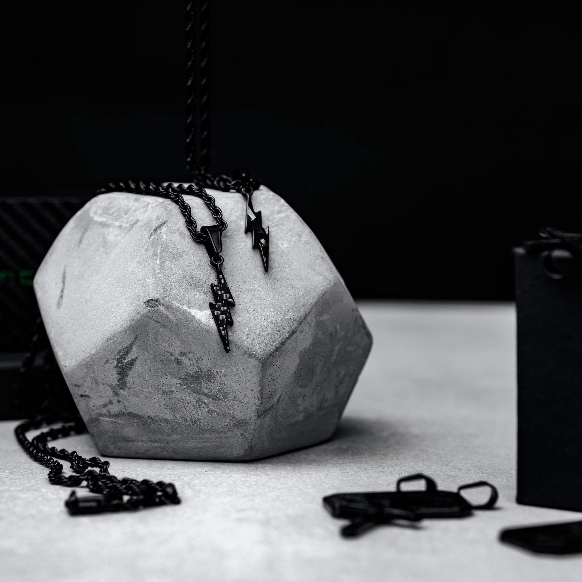 Authentische schwarze Edelstahl Halskette mit Anhänger aus Carbon Fiber (Kohlenstofffaser) oder Forged Carbon – die Carbon Halskette für Herren. Ultraleicht und robust, mit markanter Materialästhetik – von dezent bis expressiv. Carbon Schmuck Herren vereint Performance und Ästhetik. Eine Halskette mit Anhänger, Minimal in der Form, maximal in der Aussage.